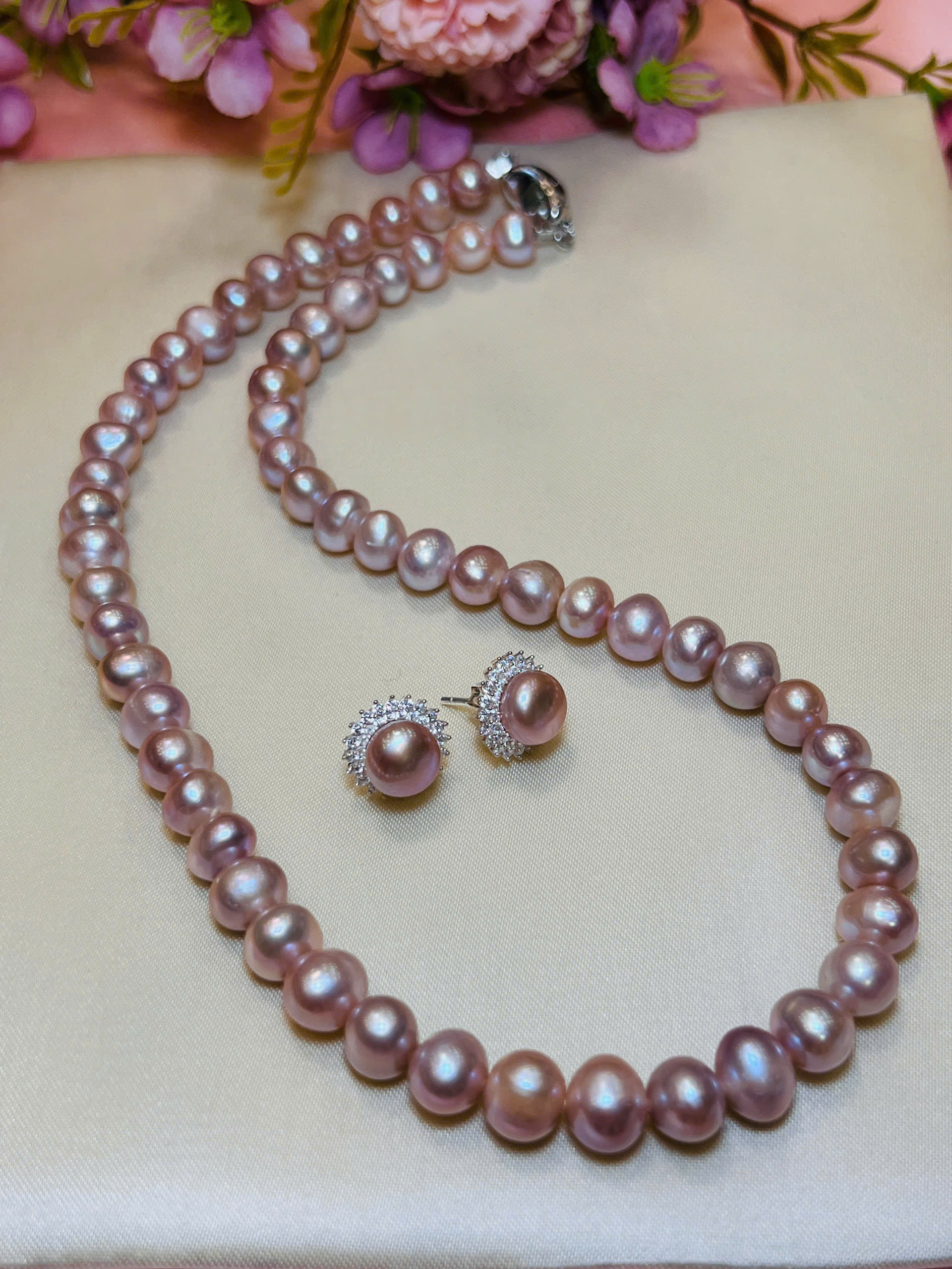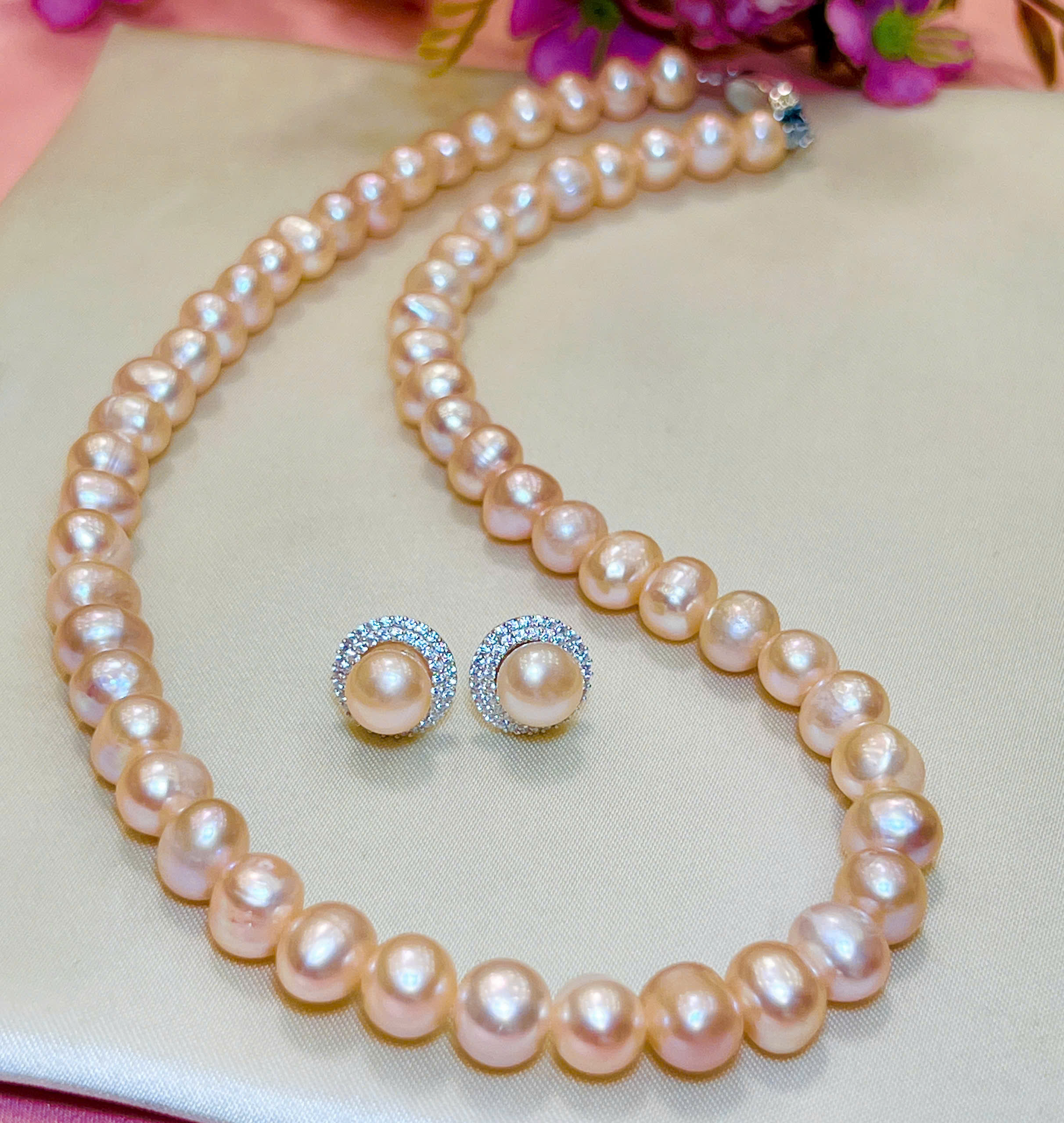 Bộ Chuỗi Ngọc Trai Thanh Lịch - Hoa Tai Chế tác bạc, Ngọc trai 7-8li ovan