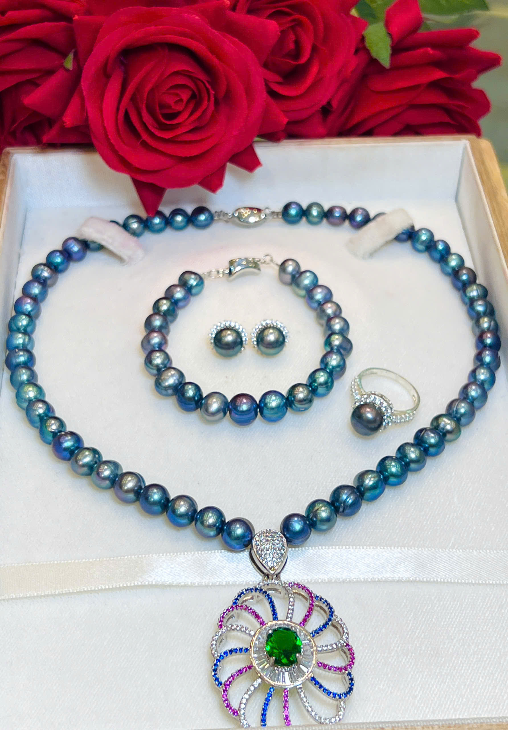 Bộ Chuỗi Ngọc Trai Xanh Lông Công Quý Phái . .