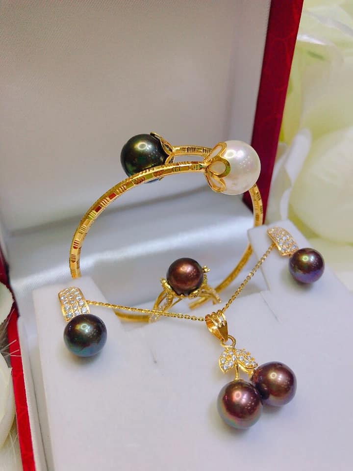 BỘ TRANG SỨC NGỌC TRAI CHẾ TÁC VÀNG ĐÍNH NGOC NƯỚC NGỌT CAO CẤP
