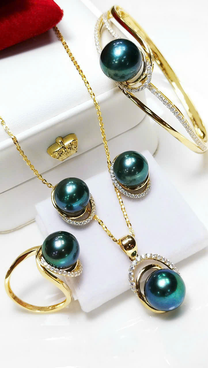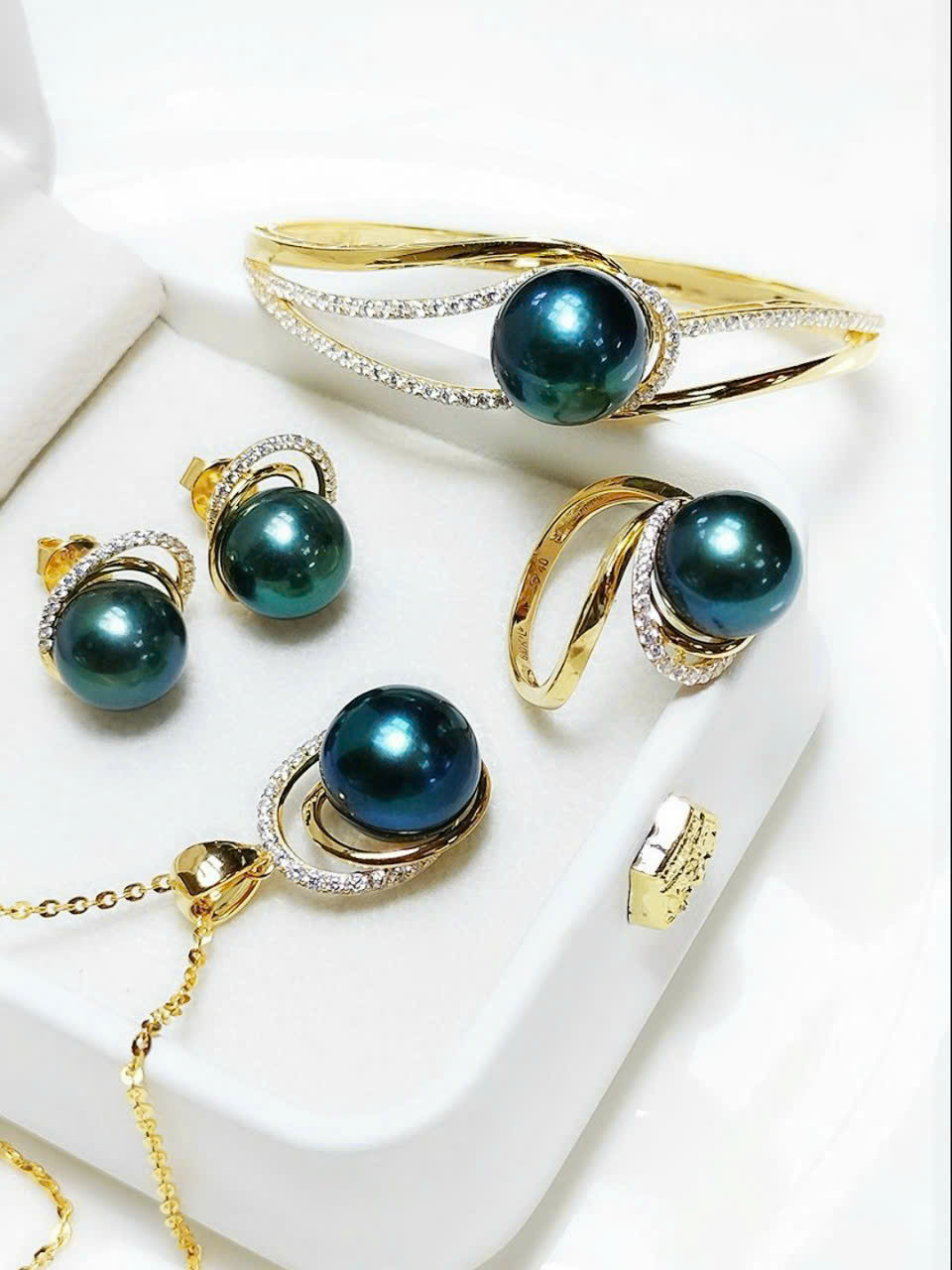 Bộ Trang Sức Ngọc Trai Xanh Lông Công Sang Trọng