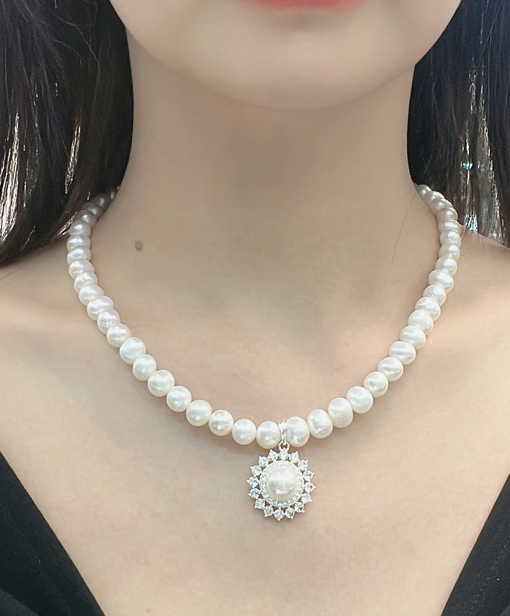 Chuỗi cổ ngọc trai kết mặt chế tác bạc sang trọng