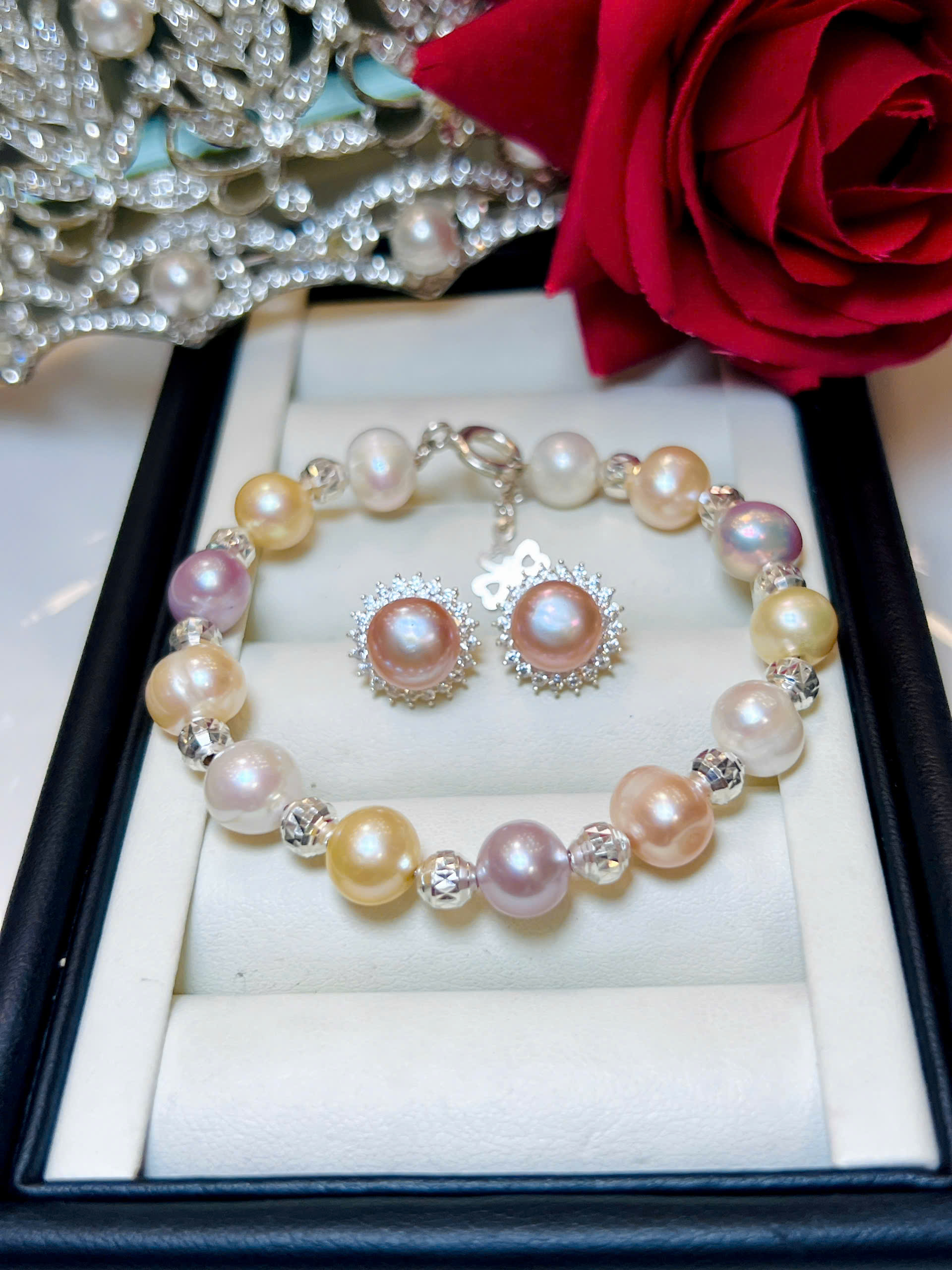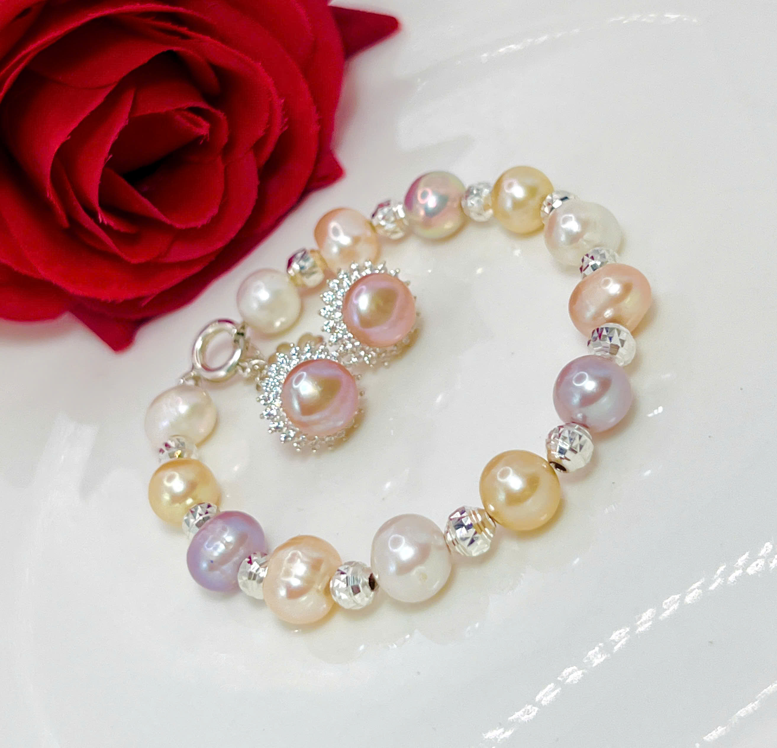 Lắc Tay Ngọc Trai Phối Bi Bạc + Hoa Tai Ngọc Trai Bạc Duyên Dáng